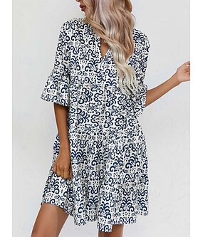 Dámské Mini šaty Volnočasové šaty Boho Chic šaty Áčkové šaty Boho šaty Čechy Vinobraní Dovolená Denní Běžný Květinový 3/4 délka rukávu Vroubkovaný krk Světlá růžová Vodní modrá Léto