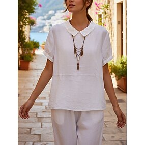 Dámské Košile Bavlněné lněné košile Halenka Bez vzoru Čechy stylové Na běžné nošení Krátký rukáv Košilový límec Běžné topy Denní Dovolená Jdeme ven Vodní modrá Bílá Námořnická modř Léto Jaro