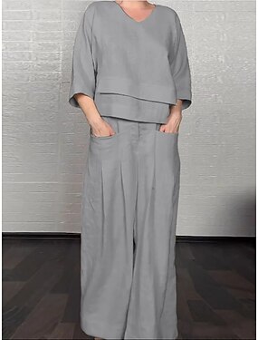 Dámské Sady kalhot Imitace bavlny a lnu 3/4 délka rukávu Do V Bez vzoru Nabírané šaty Slátanina Elegantní Módní Šik ven Ležérní Denní Venkovní Černá Bílá Tmavě námořnická Léto Běžný