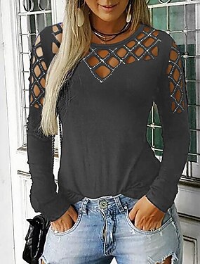 Dámské Tričko Krajkový sestřihový top Krajka Slátanina Pevná barva Elegantní Módní stylové Dlouhý rukáv Pod rameny Běžné topy Denní Jdeme ven Víkend Šedá Léto Jaro