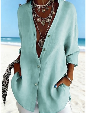 Dámské Halenka Imitace bavlny a lnu Knoflíky Pevná barva Bez vzoru stylové Na běžné nošení 3/4 délka rukávu Do V Dlouhé topy Denní Bílá Světle zelená Námořnická modř Hnědá Meruňková Léto Jaro Podzim