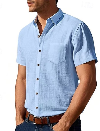 Pánské Košile Lněná košile Košile pro volný čas Košile na knoflíky Bavlněná košile Bez vzoru Dovolená ulice Černá Bílá Khaki Světle modrá Krátký rukáv Kulatý límeček Léto Oblečení Kapsy