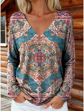 Dámské Tričko Tričko Top Tisk Květinový Grafika Čechy Vinobraní Dlouhý rukáv Do V Běžné topy Denní Jdeme ven Víkend Vodní modrá Bílá Rubínově červená Námořnická modř Dusty modrá Léto Jaro