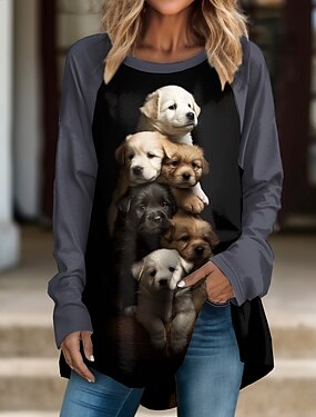Dámské Tričko Tisk Pes Módní Dlouhý rukáv Kulatý Dlouhé topy Denní Víkend Černá Světle hnědá Hnědá Jaro & podzim