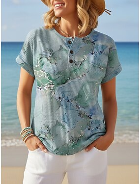 Dámské Tričko Tisk Knoflíky na hrudi Mramorový potisk stylové Moderní Na běžné nošení Krátký rukáv Henley Běžné topy Denní Vodní modrá Žlutá Fialová Trávová zelená Léto Jaro