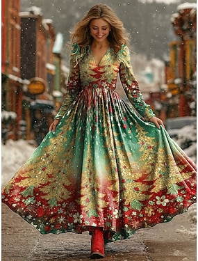 Vánoce Dámské Maxi šaty Plisované šaty Večírek Na běžné nošení Cikánský Denní Rande Jdeme ven Běžný Vánoční stromek Dlouhý rukáv Do V Rubínově červená Podzim Zima