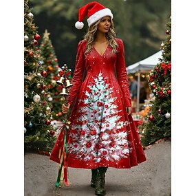 Vánoce Dámské Midi šaty Áčkové šaty prázdniny Na běžné nošení Dovolená Běžný Grafika Vánoční stromek Dlouhý rukáv Do V Rubínově červená Vodní modrá Fialová Trávová zelená Jaro Podzim Zima
