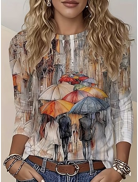 Dámské Tričko Tisk Tónované Grafika Scéna Vinobraní stylové Klasické Dlouhý rukáv Tričkový Kulatý Běžné topy Denní Vodní modrá Khaki Léto Jaro Podzim