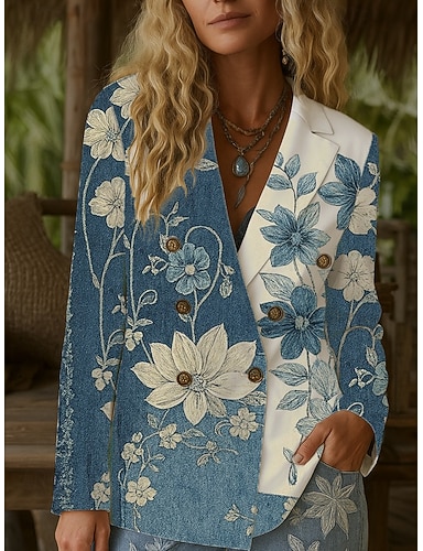 Dámské Blejzr Zahřívací Pohodlné Knoflíky Vinobraní Módní Klasické Moderní Květinový Dovolená Domů Ležérní Denní Dvouřadé Standardní Klasické klopy Běžný Dlouhý rukáv Svrchní oděvy Vodní modr