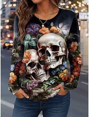 Dámské tričko lebky grafika vintage móda casual dlouhý rukáv kulatý výstřih pravidelné topy každodenní víkendový potisk růžová červená modrá šedá jaro podzim