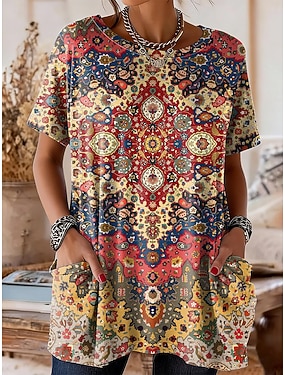 Dámské tričko boho blůza grafický geometrický vzor paisley bohémské vintage neformální krátké rukávy výstřih do V běžné topy denní víkendové plážové oblékání potisk červená modrá oranžová léto