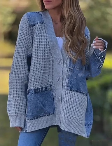Dámské Svetr Kardigan Svetr co-ords Šik ven Na běžné nošení Pevná barva Do V Knoflíky Pletený Dlouhý rukáv Běžné topy Plést Venkovní Dovolená Jdeme ven Černá Vodní modrá Podzim Zima