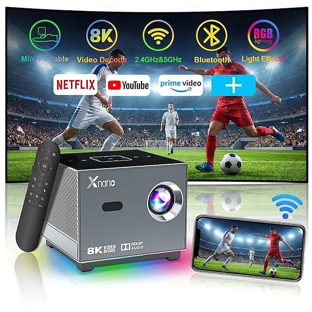 Přenosný mini chytrý projektor s Wi-Fi a Bluetooth, 2 GB + 16 GB Android, 720p LCD displej s podporou 4K/8K, hlasové dálkové ovládání domácího kina pro hraní her a filmů, dárek pro fotbalové fanoušky #10069613