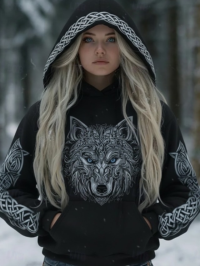 Dámské Mikina s kapucí s kapucí Slátanina Tisk Přední kapsa Grafika Zvíře Vinobraní Na běžné nošení Cikánský Dlouhý rukáv Kapuce Běžné topy Ležérní ulice Na den Černá Zima #10788418