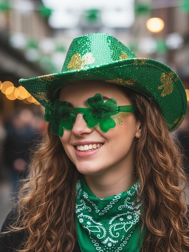 Dámský třídílný kovbojský klobouk s flitry na Den svatého Patrika, sluneční brýle s trojlístkem &sada zelených šátků – slavnostní třpytivé kostýmní doplňky pro irské průvody, večírky &oslavy #11769033