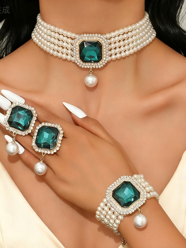 Dámská sada 3 šperků s perlami a zelenými drahokamy, vintage choker, náramek &prsten na vánoční večírky, vánoční dárky &elegantní večery#12370136