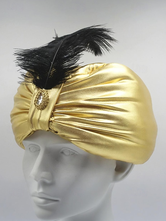 Pánský zlatý metalický polyesterový klobouk na Mardi Gras s peřím a broží - princ sultán nebo arabská pokrývka hlavy pro karneval a maškarní akce#12395855