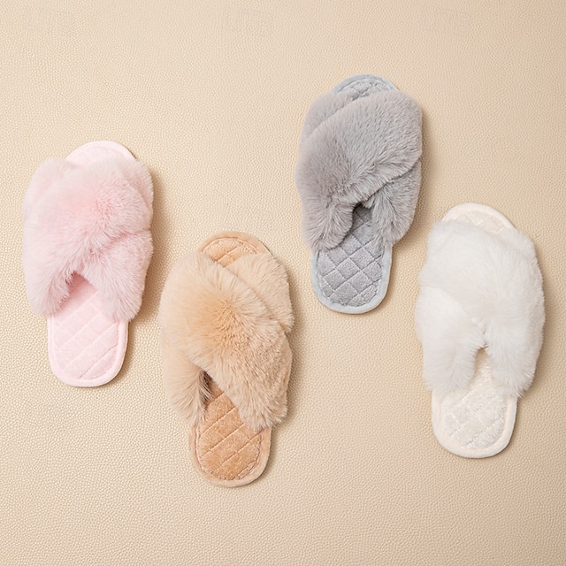 plyšové bavlněné pantofle pro ženy, zimní s křížovým páskem, vnitřní teplé měkké chlupaté domácí pantofle, útulná obuv#12546163