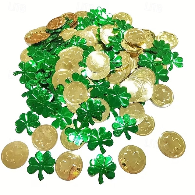 Dekorace na stůl ke Dni svatého Patrika, 100 ks plastových mincí pro štěstí a 30 g trojlístkových konfet na stůl, posypky na stůl pro irskou párty svatého Patrika, dárky, potřeby#13155142