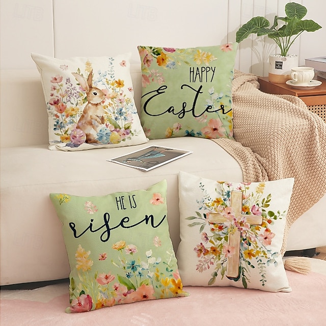 Sada 4 lněných prodyšných povlaků na polštáře s potiskem velikonočních zajíčků, jarní domácí dekorativní povlaky na polštáře na pohovku#13371562