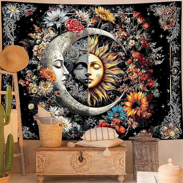 Gobelín slunce a měsíc na zeď, nebeské květiny, slunečnice, růže, boho hippie nástěnné umění do ložnice, obývacího pokoje, jógy, meditační dekorace#14624550