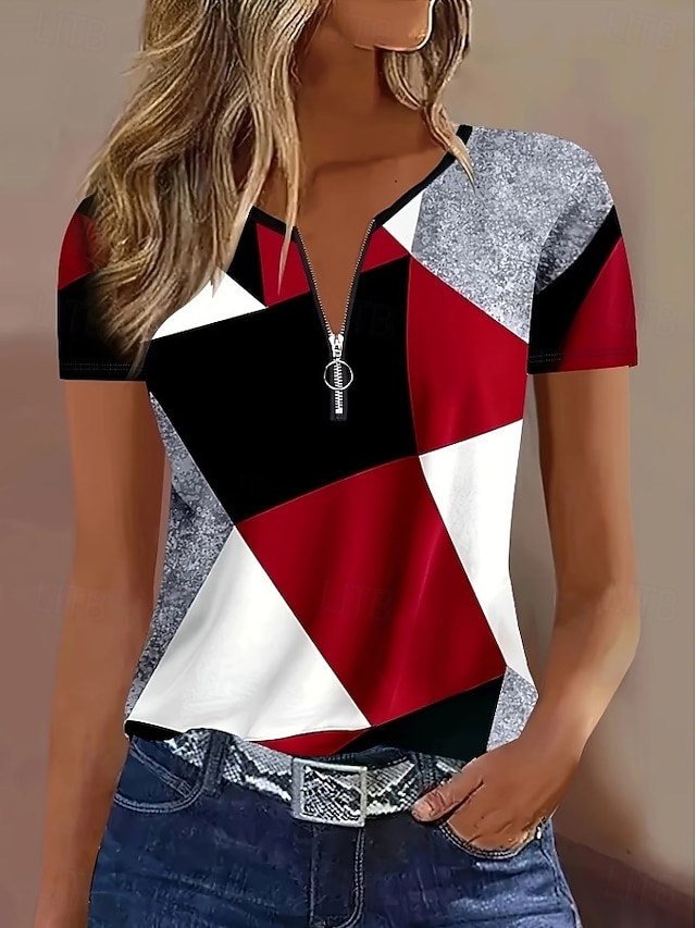 Látka:Polyester,Pohlaví:Dámské,Typ topu:Tričko,Design:Čtvrtletní zip,Zip,Příležitost:Víkend,Jdeme ven,Sport,Denní,Svatba na pláži,Oblečení na pláž,Oblečení na dovolenou,Styl:Vinobraní,Na běžné nošení,Plážový styl,Tropický vzhled,Havajské,stylové,Klasické,Kategorie:Trička,StřIh:Tvarovaný potah,Výstřih:Tričkový,Délka rukávů:Krátký rukáv,Elasticita:Lehce elastické,Údržba:Prát v pračce,Prodloužené:Běžné topy,Vzor:Grafika,Abstraktní,Geometrický,Sezóny:Jaro,Léto,