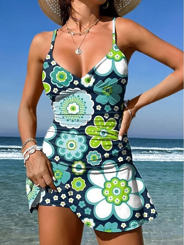 Dámské Plavky Jeden kus Sukně Plavky Elegantní prázdniny Květinový Grafika Do V Bez rukávů Plavky#15134382