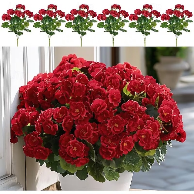 6 větví, kytice z umělých pelargónií odolných proti UV záření, 30 stonků/větví, zářivě červené květy s bujným zeleným olistěním, realistická plastová dekorace do interiéru/venkovního prostředí,#15447511
