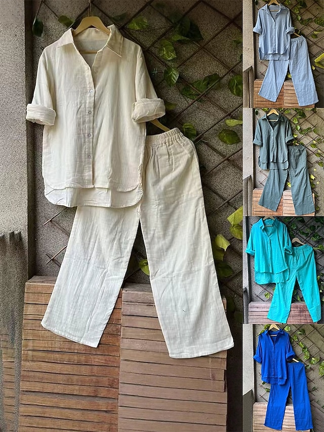 Dámské Sady kalhot Bolero Imitace bavlny a lnu Dlouhý rukáv Košilový límec Pevná barva Módní Šik ven Ležérní Denní Venkovní Vodní modrá Bílá Oceánová modř Léto Volný #16156456