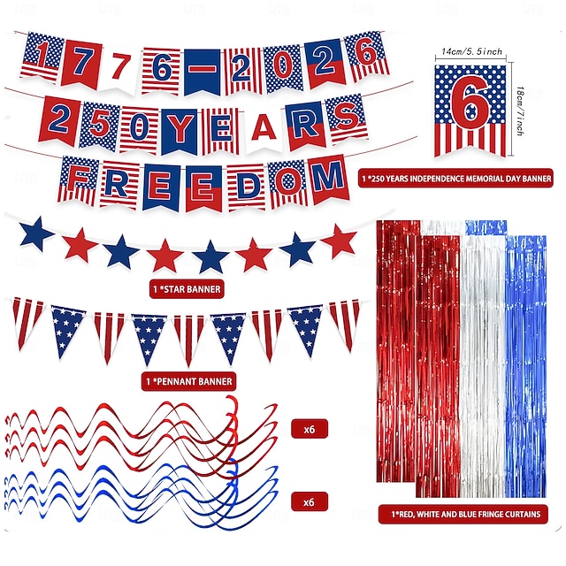Sada dekorativních bannerů k 250. výročí Dne nezávislosti USA, obsahuje 24 bannerů, 10 vlaječek, 8 stuh, 12 spirálových závěsů a 2 tylové závěsy. &1 ubrus, ideální na oslavy Dne nezávislosti#16322411