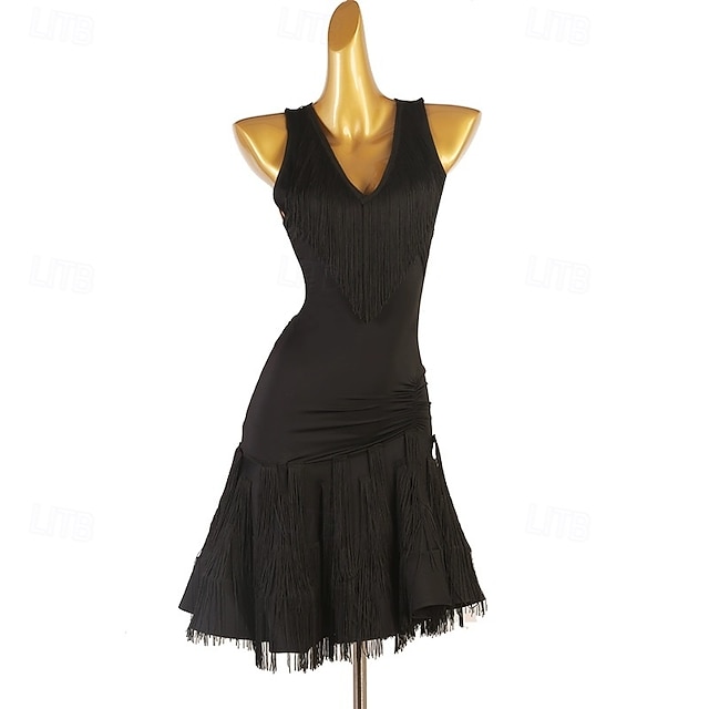 Elegantní černé šaty s třásněmi na latinskoamerické tance pro ženy - kostým s výstřihem do V a bez rukávů na společenský sál, salsu a tango #16427712
