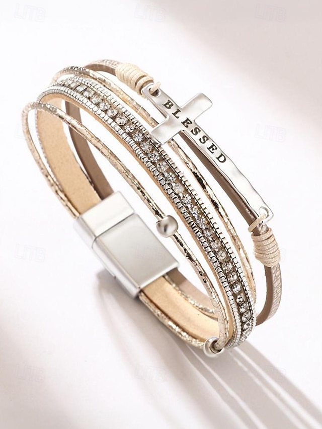 Dámský vícevrstvý náramek s křížkem a kamínky – inspirativní „požehnaný“ náramek z umělé kůže pro běžné nošení, do kostela i na zvláštní příležitosti#17518217