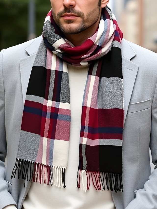 Pánská vánoční kostkovaná šála – stylová polyesterová šála s třásněmi – dostupná v několika barvách – teplý sváteční doplněk pro muže #18149824