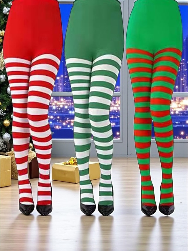Dámské vánoční pruhované punčocháče, slavnostní červeno-zelené strečové legíny na sváteční kostýmy &párty oblečení 2026 - $7.99 –P3