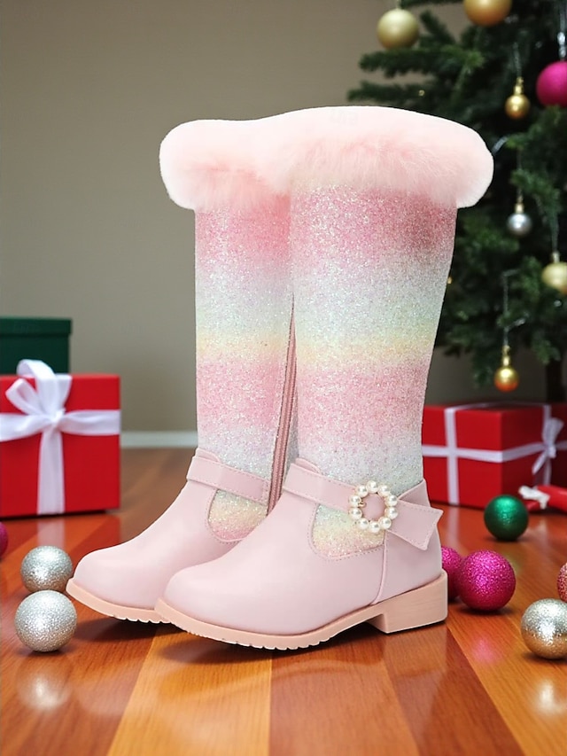 Dívčí duhové třpytivé kozačky pod kolena s lemem z umělé kožešiny a perleťovou sponou - třpytivé zimní boty pro děti na párty a svátky.#18821425