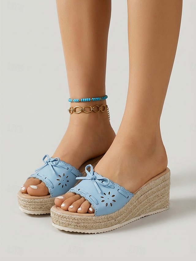 Dámské světle modré espadrilkové sandály na klínku - elegantní laserově řezané nazouvací pantofle s mašlí pro luxusní plavby, letní večírky na palubě &oblečení pro tropické resorty#9831804