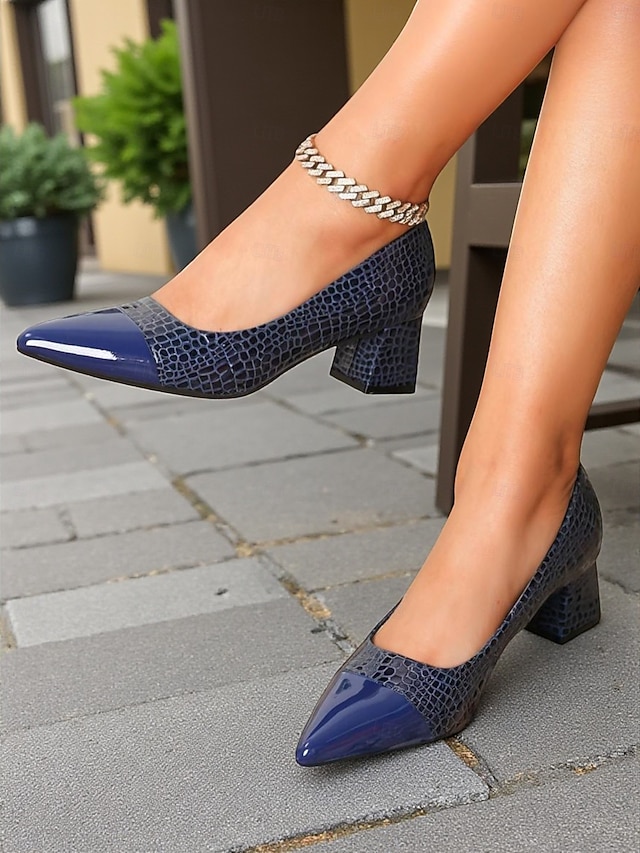 Dámské tmavě modré lakované kožené lodičky na blokovém podpatku – elegantní boty s špičatou špičkou a reliéfním vzorem z krokostříhlé kůže do kanceláře, na večírky a formální akce#9875610