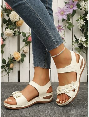 Dámské hnědé sandály na klínku s květinovým vzorem - měkká polstrovaná stélka, prodyšná pohodlná obuv s otevřenou špičkou, ležérní bohémský styl na chůzi, cestování, letní dovolenou, outdoorové