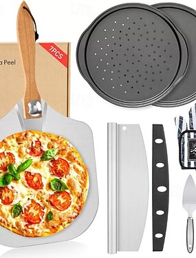 7dílná pizzová forma s dřevěnou rukojetí, pizza s termorukavicemi, dlouhý kráječ, sada na pečení pizzy