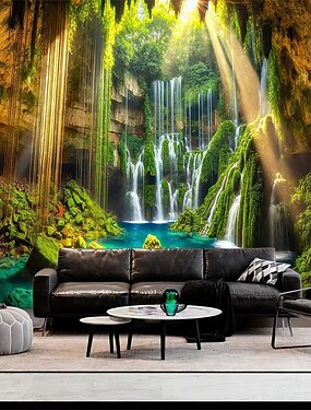 hluboký les mechový vodopád příroda krajina nástěnná tapiserie zelená les kaskádovitá voda nástěnná dekorace bytové dekorace obývací pokoj ložnice kancelář umění nástěnná malba pozadí