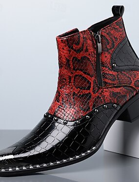 Pánské červené kotníkové boty s hadím vzorem z pravé kůže, kovovou špičkou a zipem, westernové kotníkové boty ze 100% hovězí kůže na večírky, vystoupení a do nočních klubů