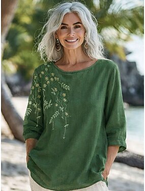 Dámské Halenka Košile z imitace lnu Výšivka Knoflíky Květinový stylové Na běžné nošení 3/4 délka rukávu Tričkový Běžné topy Denní Žlutá Fialová Trávová zelená Šedá Léto Jaro Podzim