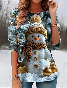 Vánoce Dámské Tričko Tisk Grafika Sněhulák Vinobraní Módní stylové Dlouhý rukáv Tričkový Kulatý Běžné topy Denní Víkend Vodní modrá Světle zelená Světlá růžová Rubínově červená Oranžová Podzim Zima