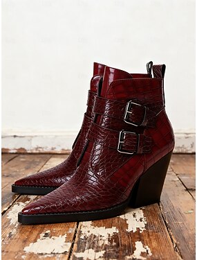 Dámské vínové kotníkové boty s krokodýlím vzorem a dvojitými přezkami, stylové vysoké podpatky s špičatou špičkou pro módní ležérní i večerní nošení