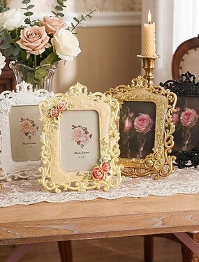 1 ks, fotorámeček s reliéfními růžemi v evropském stylu a trojrozměrnými klasickými vzory, vyrobený z pryskyřice, vhodný pro bytové dekorace a fotorámečky do ložnic nebo kancelářských stolů.