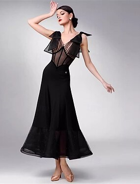 Dámské šaty na společenský tanec, černé, průsvitné, síťované, s volánky a rameny, elegantní, na valčík, foxtrot, soutěžní a taneční vystoupení