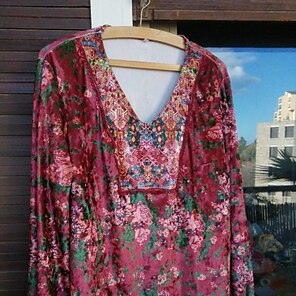 Je ne regrette pas lachat de cette tunique en panne de velours dinspiration slave.  jai juste ajouté un petit galon en dentelle qui donne encore plus de cachet au plastron sinon, taille et coupe sont parfaites. Aucune déformation après lavage. Bonne tenue !