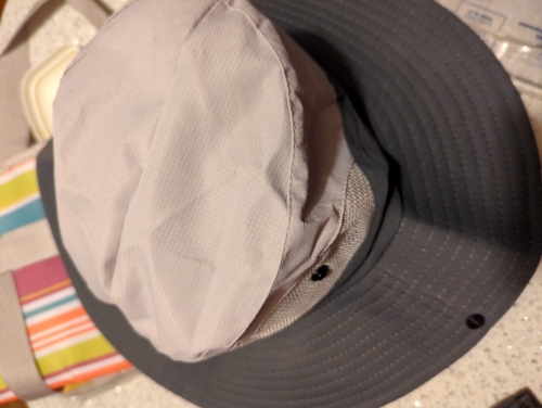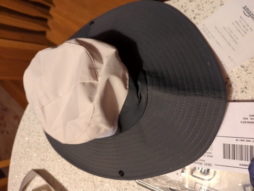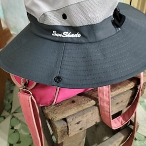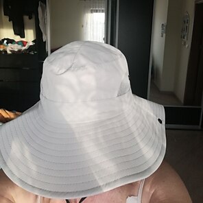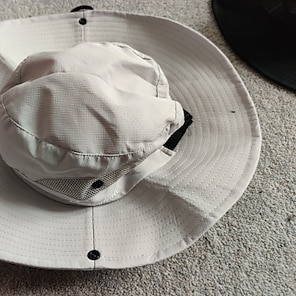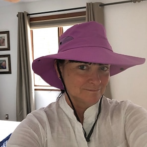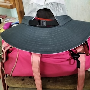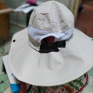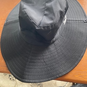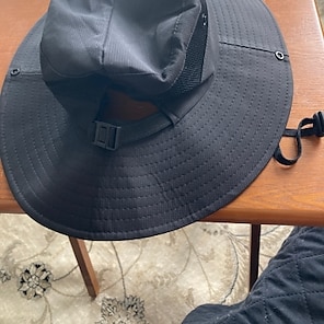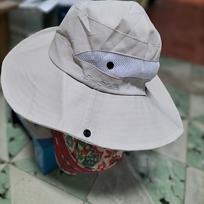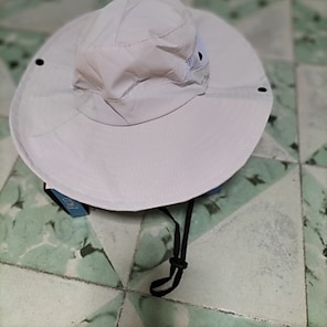 Hermoso sombrero!!! Muy práctico, cómodo y protege muy bien la  cabeza y la cara del sol, ya que es de ala ancha; perfecto para lugares en donde el sol es muy fuerte como aqui en donde vivo. Tiene como un tipo de correita para ajustarlo y también trae cordon para ajustarlo en el cuello.  El color, identico al de la foto. El material es de un tipo de tela que aunque se moje, el agua resbala. Un regalo que le  hice a mi esposo, ya que el sombrero es unisex y quedó encantado !!!