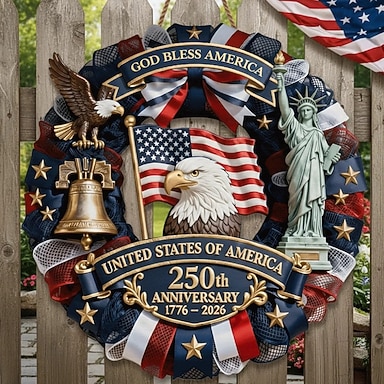 Dřevěná cedule s vlasteneckou cedulí k 250. výročí USA, dekorace na dveře s orlem, Zvonem svobody a Sochou svobody ke Dni nezávislosti, 1776–2026, dekorace na vstupní dveře ke 4. červenci
