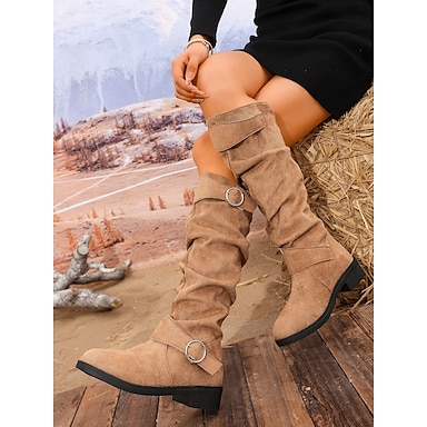 Dámské semišové kozačky s přezkou – retro podzimní ležérní kozačky na plochém podpatku pro každodenní outfity, cestování a outdoorový styling